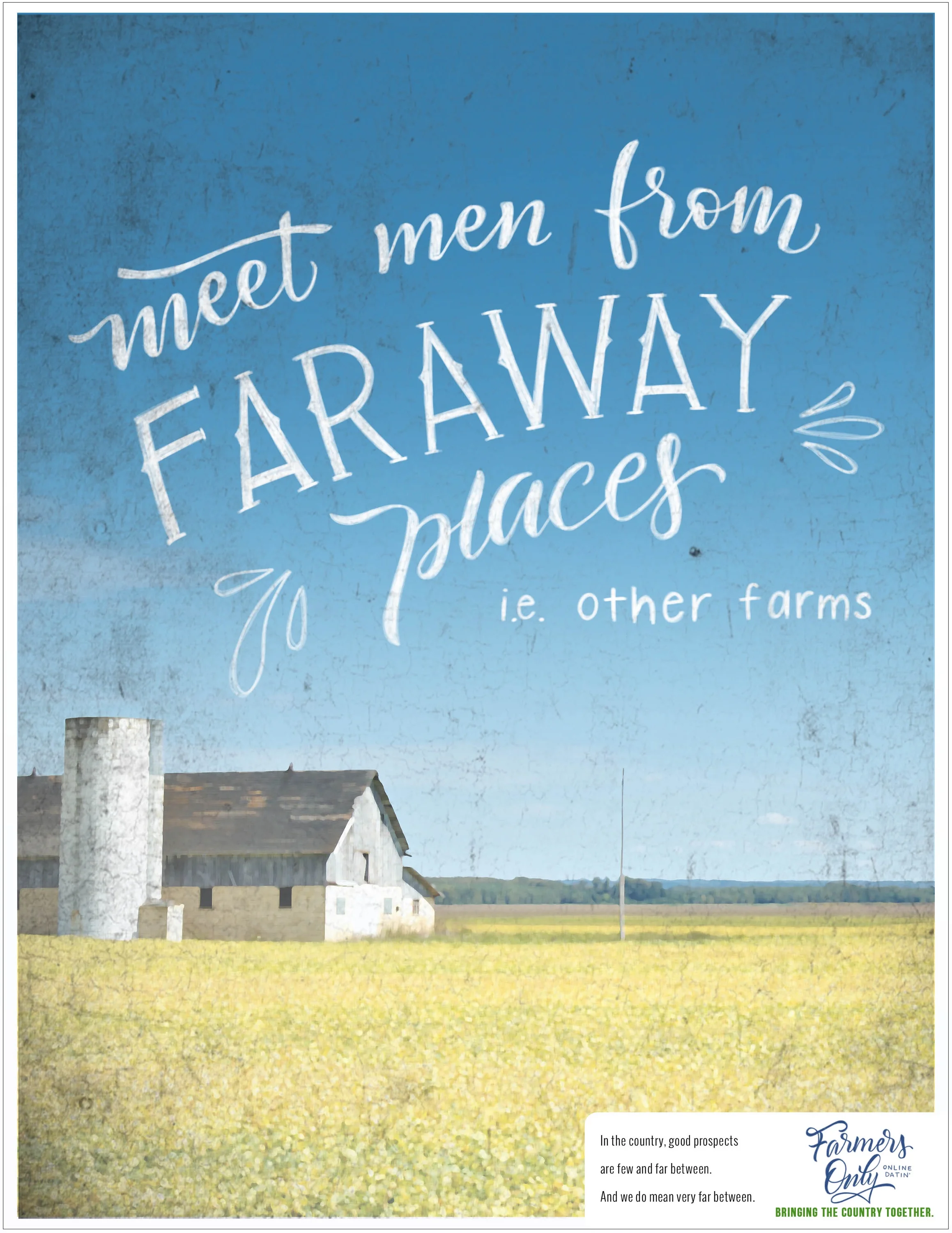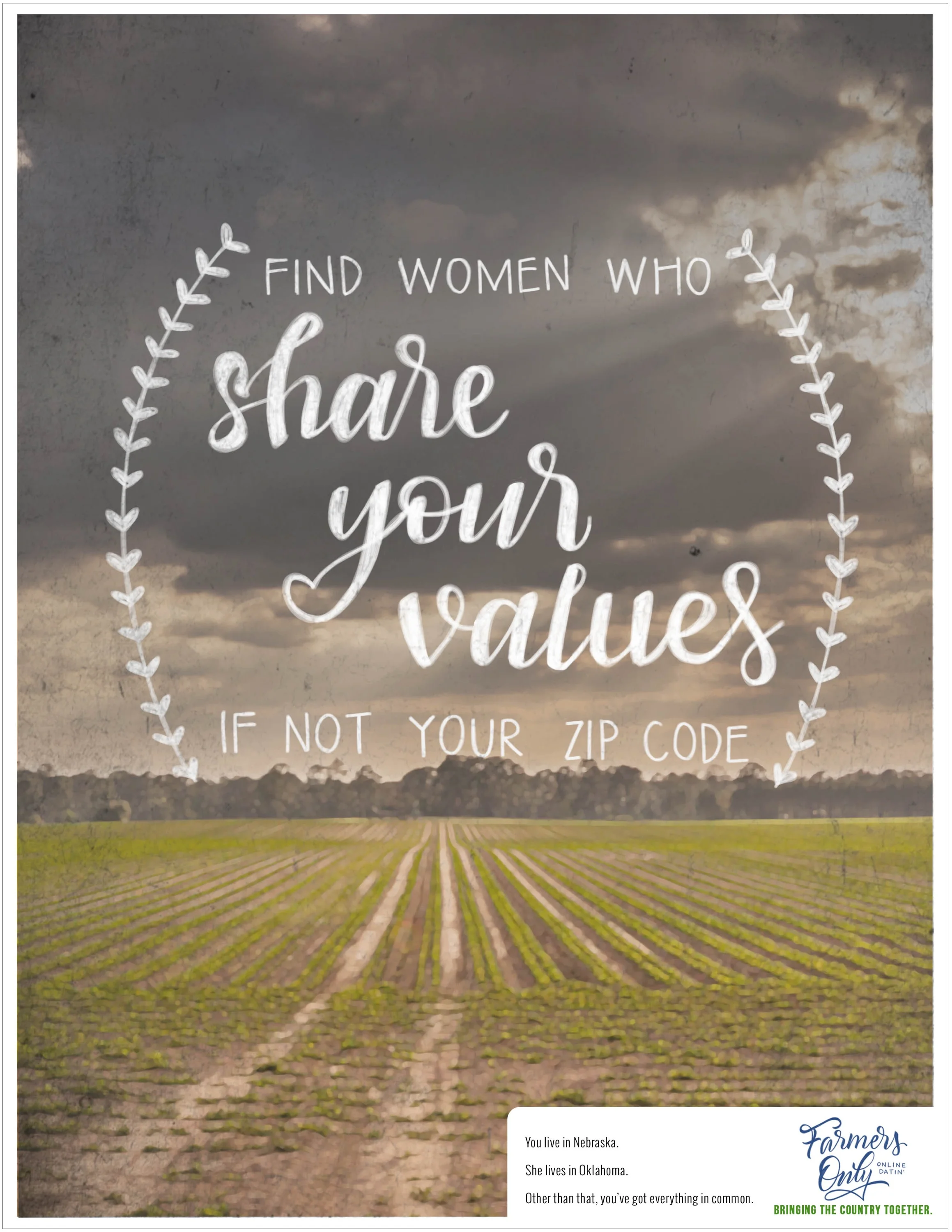 ANNCR: In Niobrara County, Wyoming, there are sprawling ranches, dinosaur bones and one person per square mile. So it's hard to find your neighbor if you need a cup of sugar, let alone a date. Farmers Only helps you connect with cute country people by the power of the Internet. Even if you've lived apart all your life, you can still make someone a part of your life. Farmers Only. Online datin'. Bringing the country together.